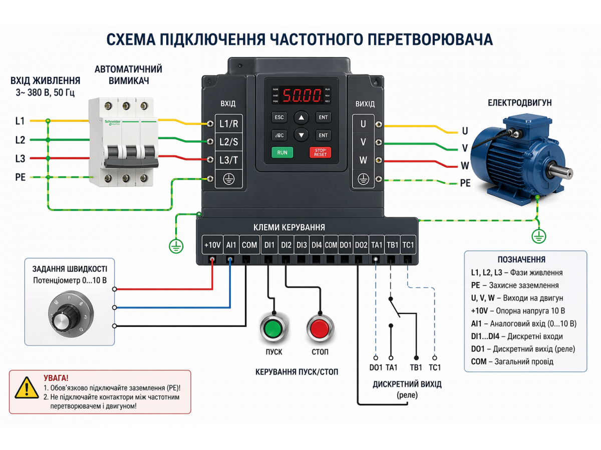 Типова схема підключення частотного перетворювача в реальному щитку виглядає доволі просто: